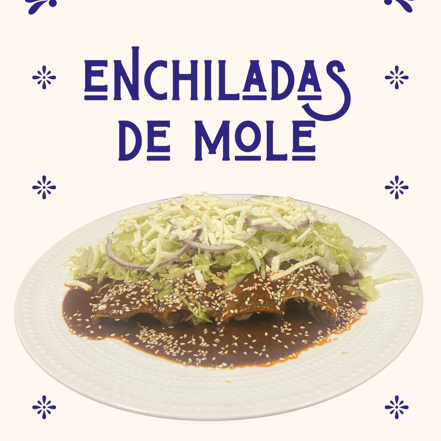 4 Mole enchiladas with your choice of filling (Chicken or Cheese) topped with lettuce, red onions. sesame seeds, and queso fresco.