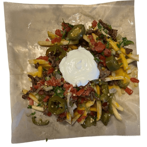 French fries with nacho cheese, cilantro, onion, tomatoes, sour cream, jalapeños, and your choice of meat