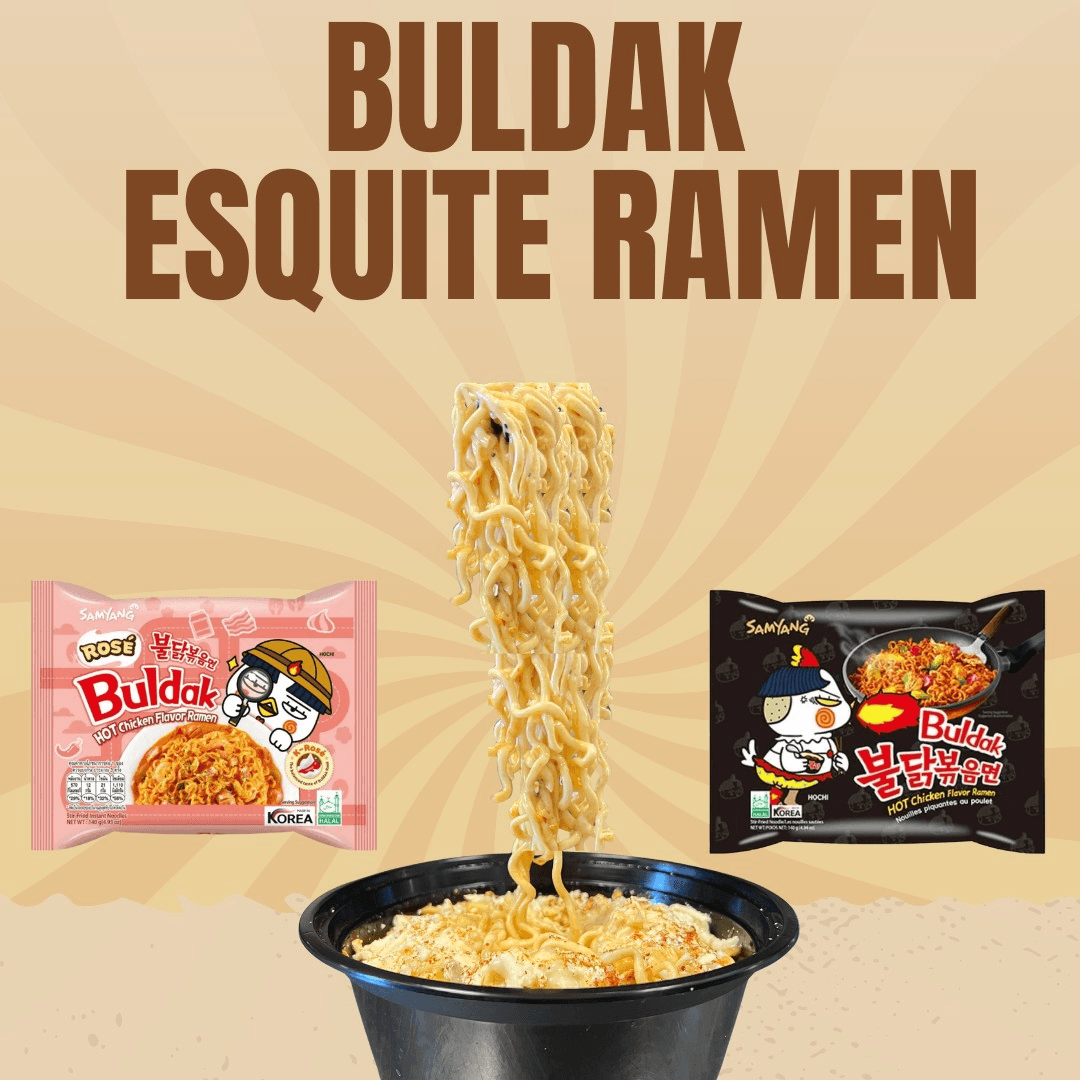 Spicy Korean Buldak ramen tossed with sweet corn, creamy mayo, fresh lime, chili spice, and cotija cheese — a fiery, street-style fusion you won’t forget.