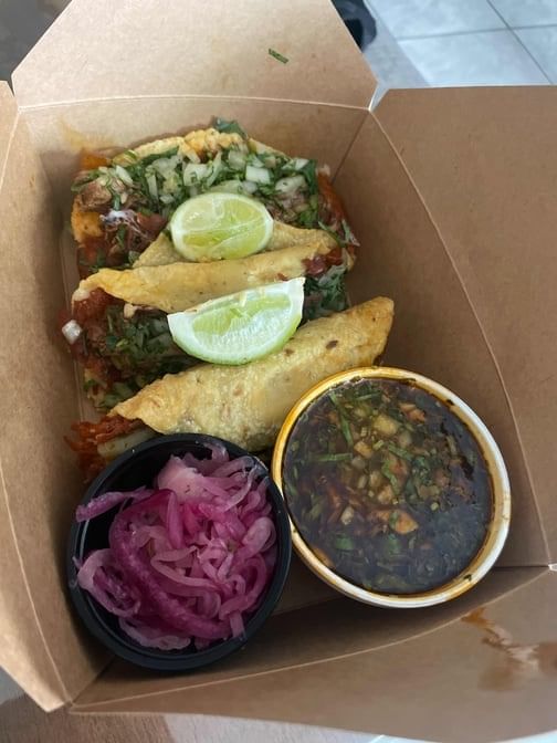 Beef birria tacos comes with onions and cilantro. Side of consome, limes, marinated onions, Chips and your choice of Salsa.