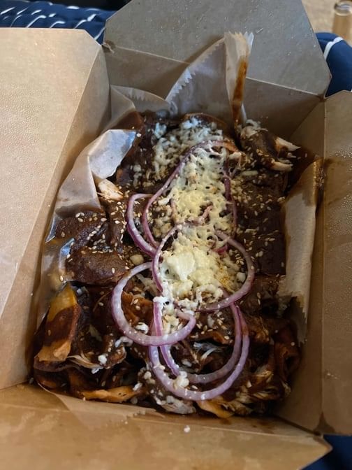 Tortilla chips topped with mole poblano, with shredded chicken, ajonjoli, onion, and queso fresco