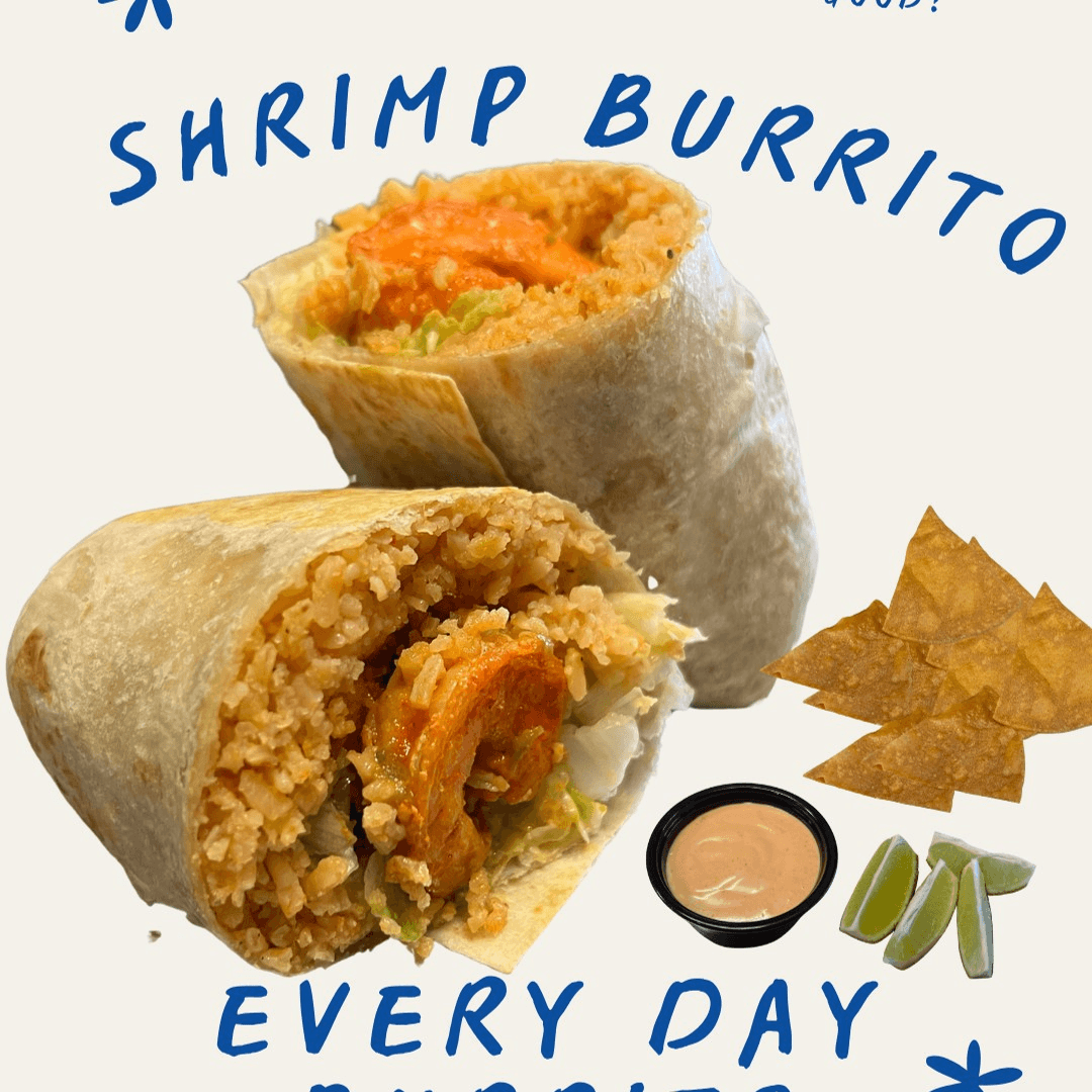 Rice, Shrimp, Dip, Avocado and Lettuce. Comes with a side of Chips