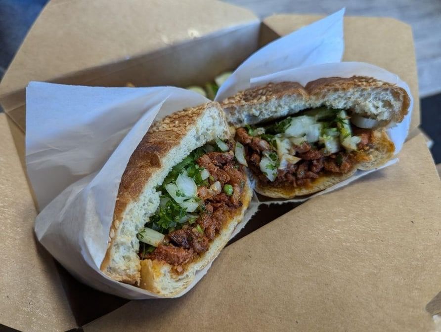 Sesame artisan bread, beans, chorizo mixed with melted cheese, lettuce, tomatoes, red onions, avocado, mayo, and jalapeños