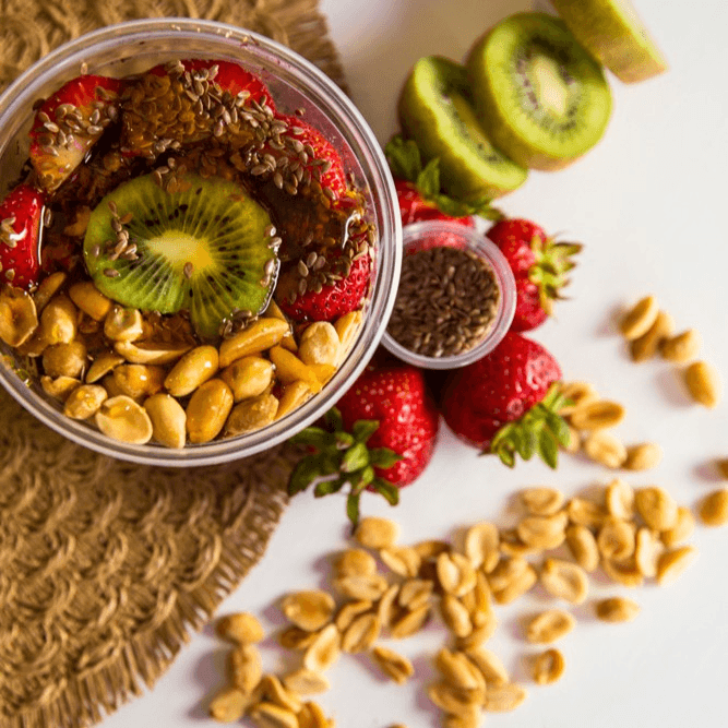 Raw açai blended with dates topped with granola, roasted peanuts, strawberry, kiwi, flax seeds, and honey