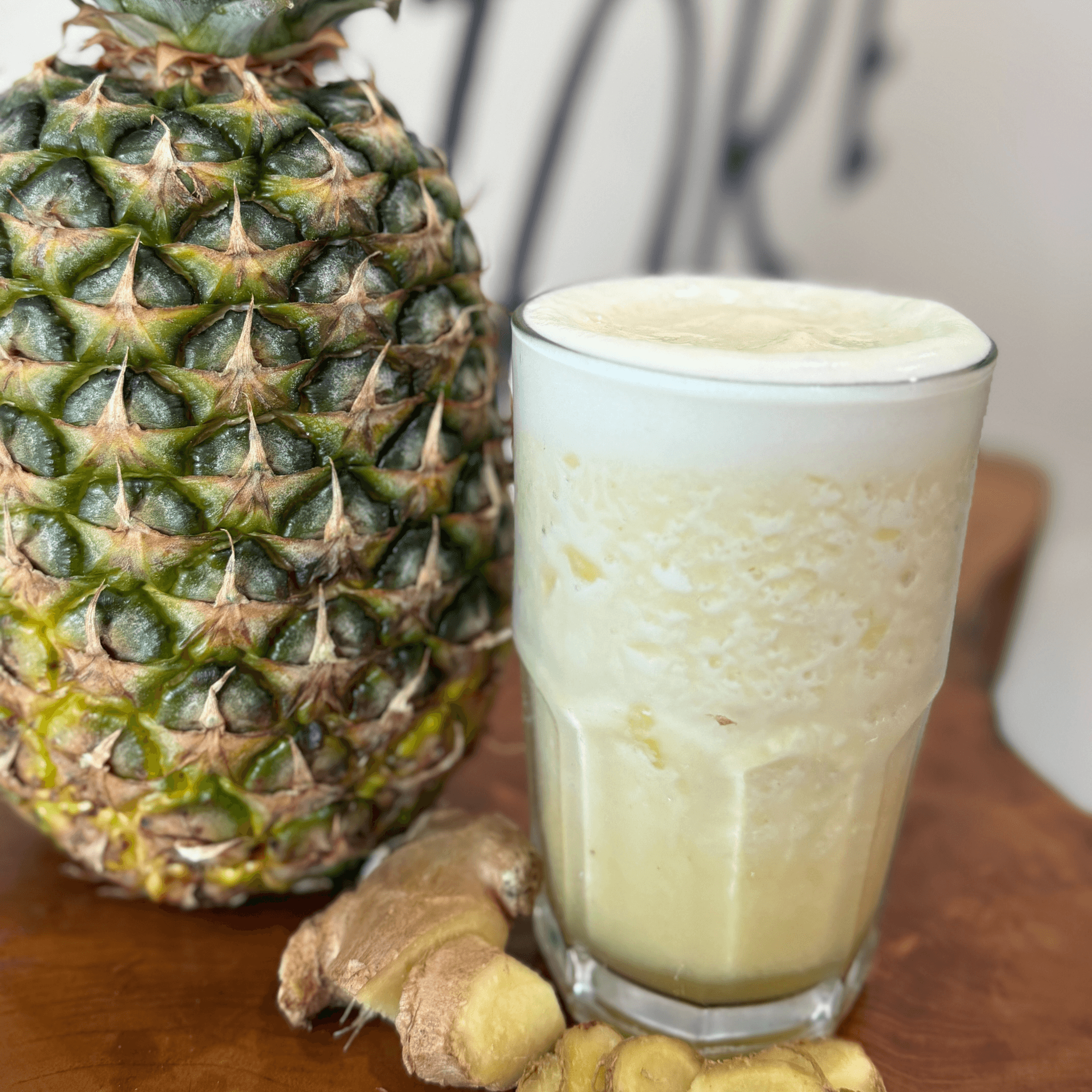 Coconut water base, pineapple, ginger and raw sugar.
