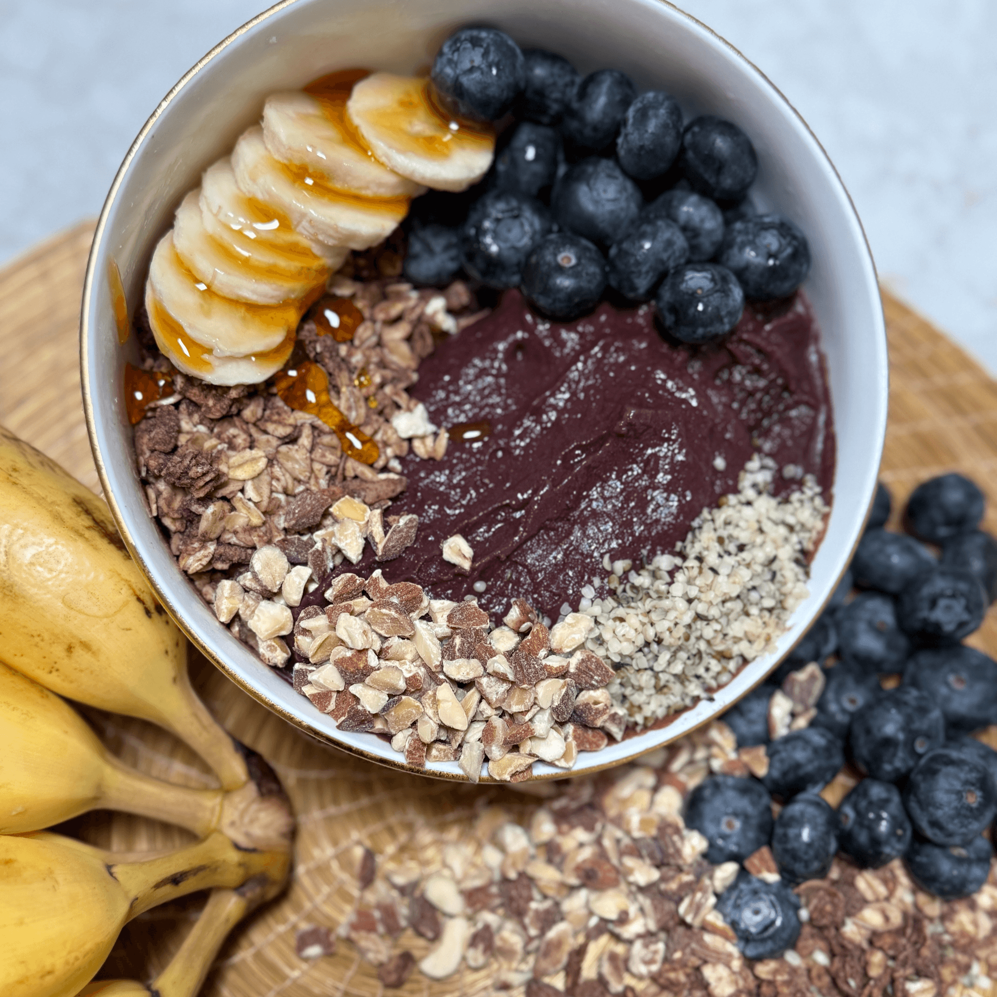 Açai base, granola, banana, blueberry, almonds, hemp seeds and honey.