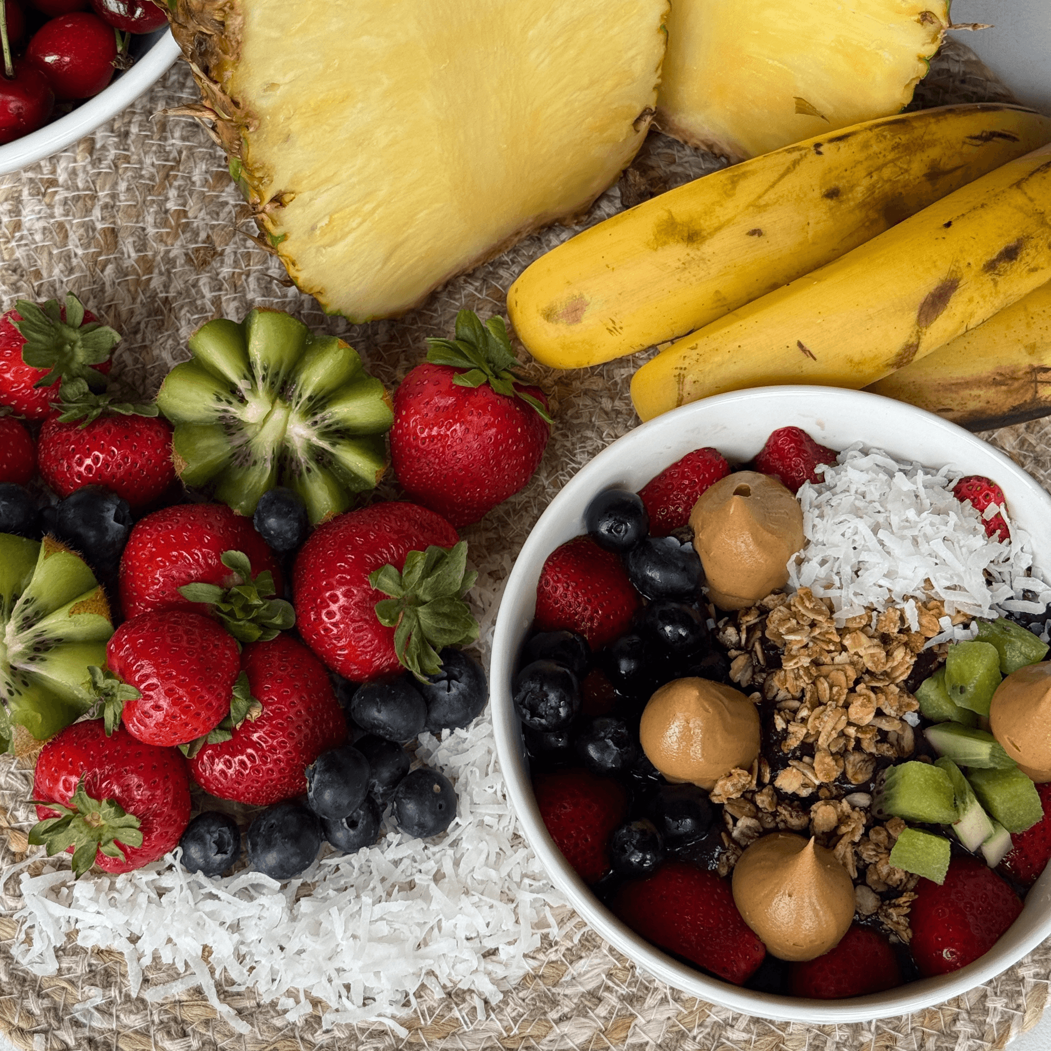 Açai blended with pineapple granola, banana, strawberry, kiwi, coconut shavings and peanut butter
