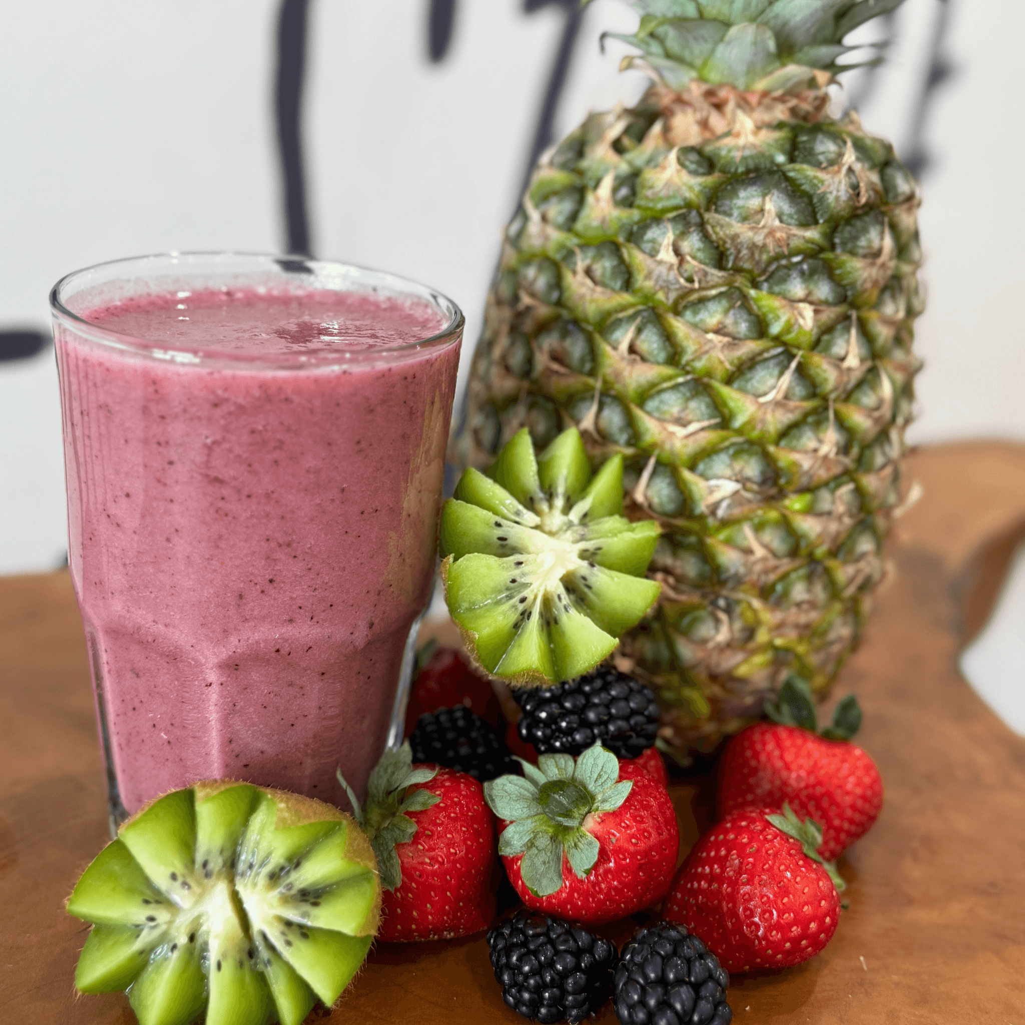 Coconut water based blended with blueberry, pineapple, kiwi, strawberry sweetened with honey.