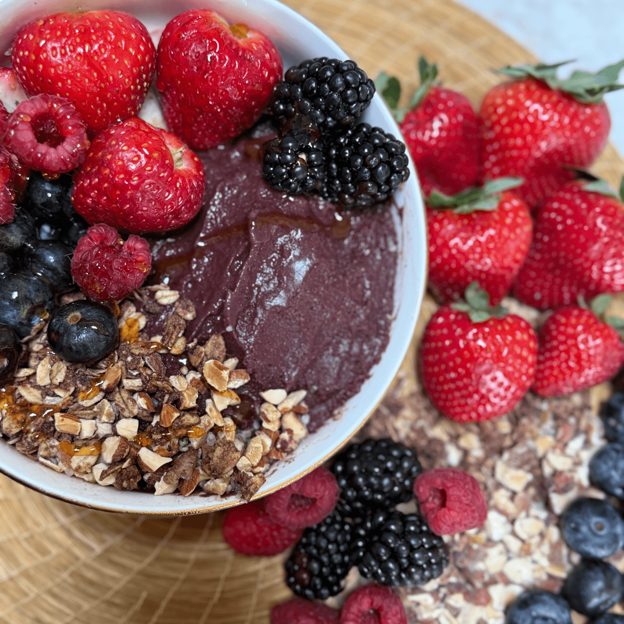 Açai base, granola, almonds, strawberry, blueberry, raspberry, blackberry and honey.