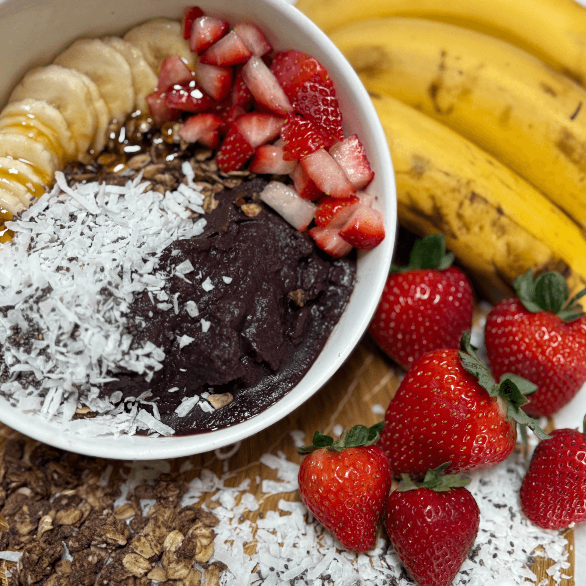 Açai base, granola, banana, strawberries, coconut shavings, chia seeds and honey.